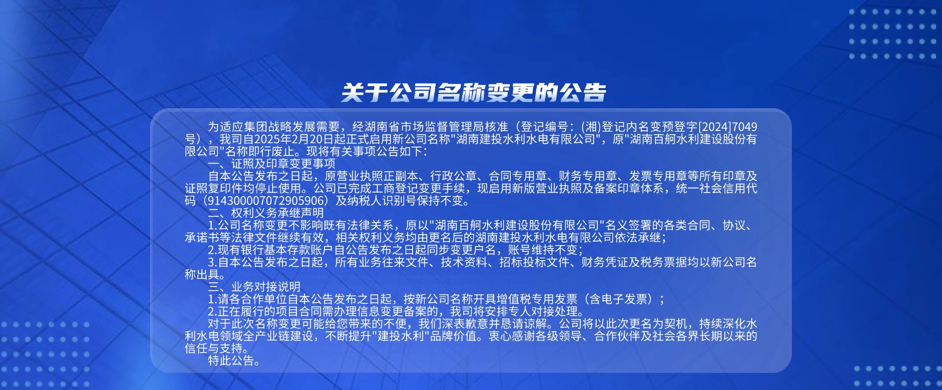 2022年9月,原湖南建工集團(tuán)與原湖南交水建集團(tuán)合并組建湖南建設(shè)投資集團(tuán)。原雙方集團(tuán)旗下的湖南百舸水利建設(shè)股份有限公司和湖南建工集團(tuán)水利水電工程公司合并為湖南建投百舸水利公司,實(shí)行兩塊牌子(百舸水利、建工水利)管理,為湖南建投集團(tuán)唯一水利建設(shè)企業(yè)。2024年9月,公司正式更名為湖南建投水利水電有限公司(簡(jiǎn)稱(chēng)湖南建投水利),統(tǒng)籌管理“百舸水利”“建工水利”“施工公司”“疏浚公司”等子品牌。