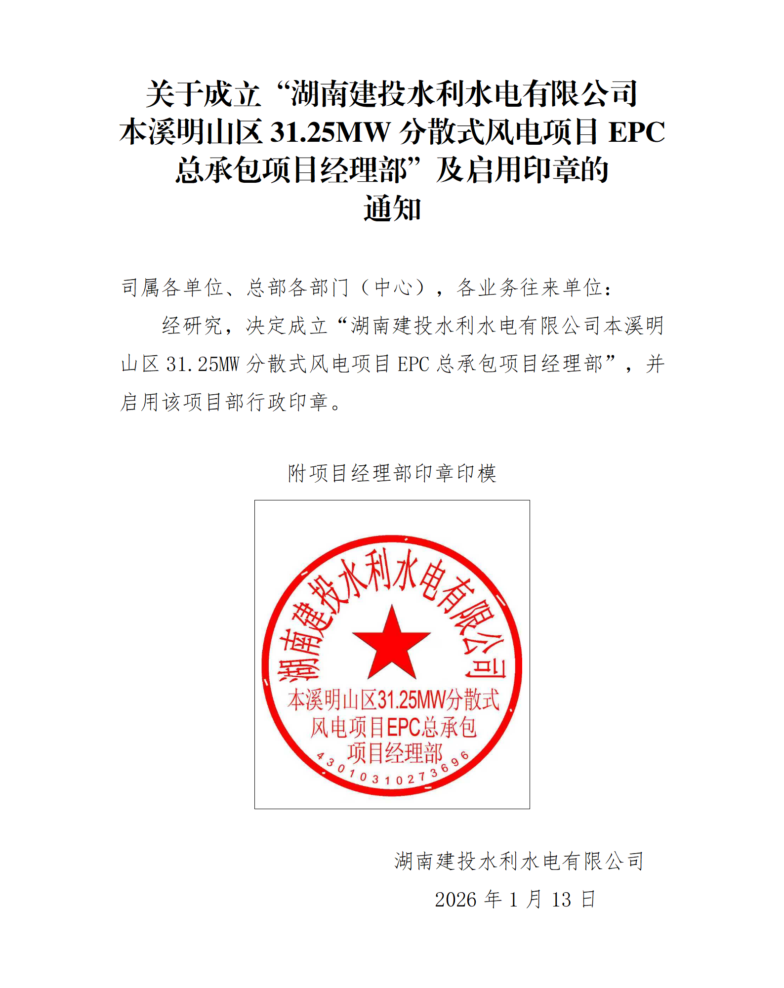 關于成立“湖南建投水利水電有限公司本溪明山區(qū)31.25MW分散式風電項目EPC總承包項目經理部”及啟用印章的 通知